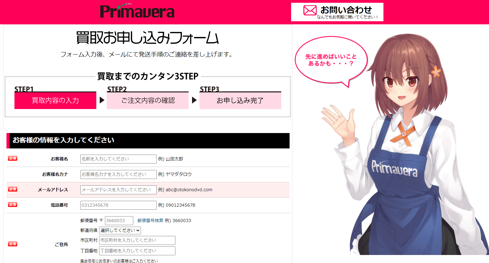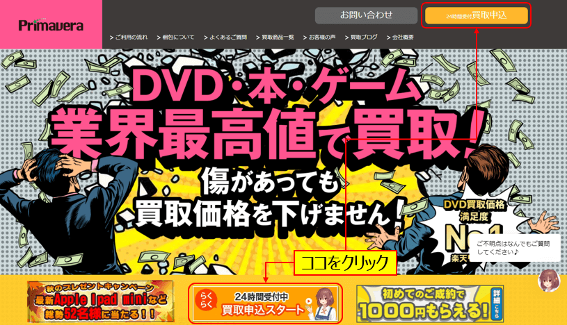 まずは買取HPを開きましょう。下記URLから買取HPに飛ぶ事が出来ます。または検索サイトにて「プリマベーラ 買取」などで検索すればヒットします。