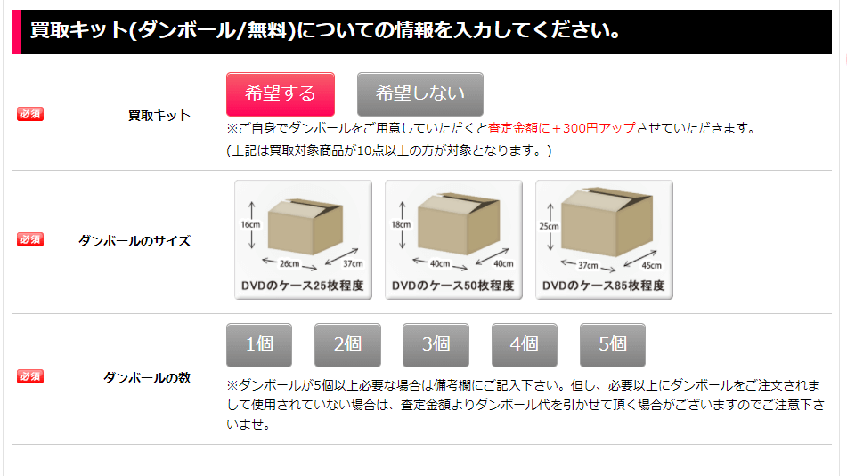 手順2:希望するをご選択の方は、ダンボールのサイズを選びます。