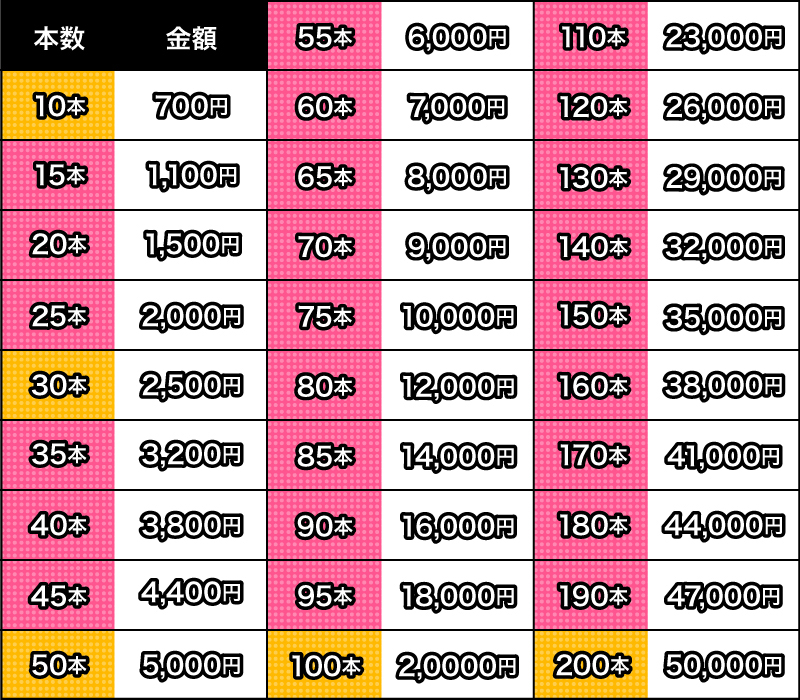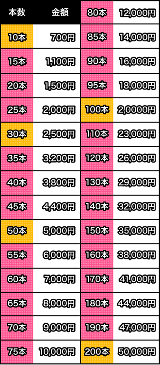 50本で5,000円、100本で20,000円、200本で50,000円、400本なら100,000円!お売り頂ける本数が多ければ多いほど査定もプラスアップ!