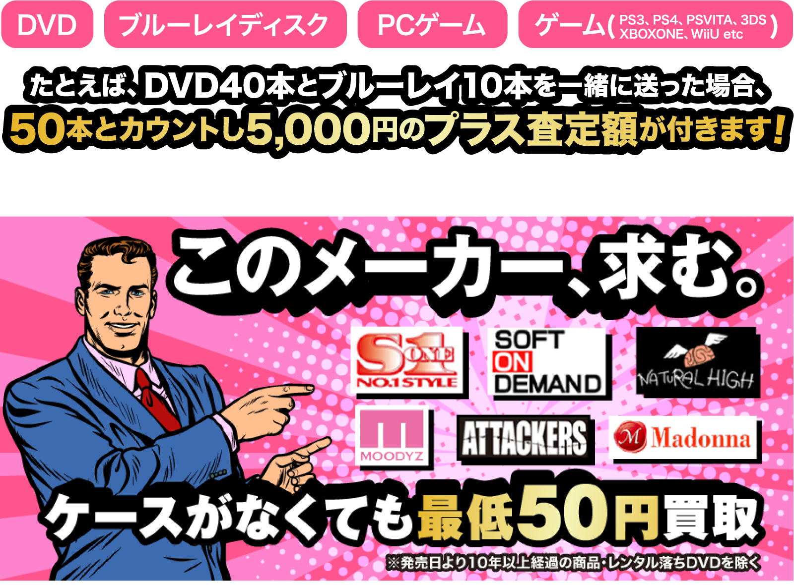 直営の全24店舗とインターネット通販を比べ、一番高く売れる販路を元に査定をし、買取金額を決めています。販路が複数ある分、本やDVDの在庫を抱える余裕がありますので、DVDなら買取金額アップキャンペーンも可能。ブルーレイ・PCゲーム・家庭用ゲームもまとめ買取(プラスアップ査定)の対象になるのでお得です。