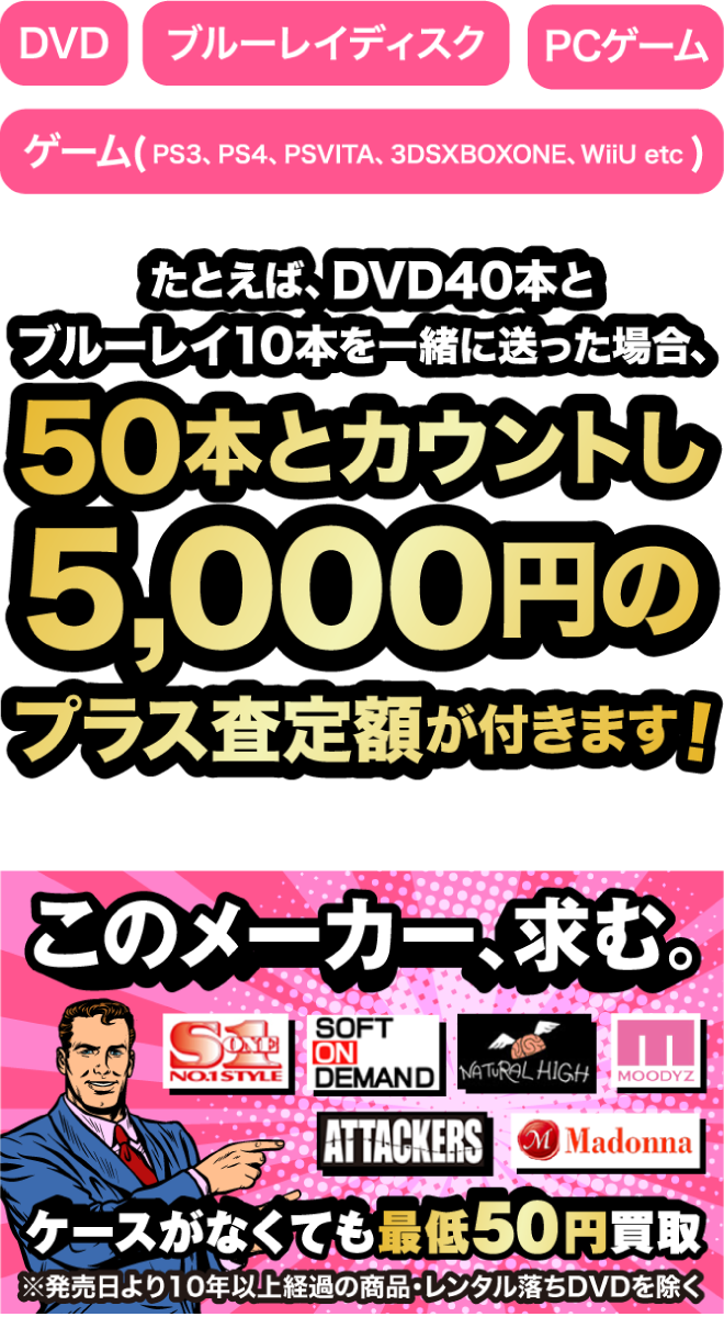 商品点数合計 50点 アダルトDVD(AV)33点 一般DVD 17点 プリマベーラでは 古いアダルトDVD(AV)でも 喜んで買取致します! 盤面にキズがあっても査定金額 を下げません!